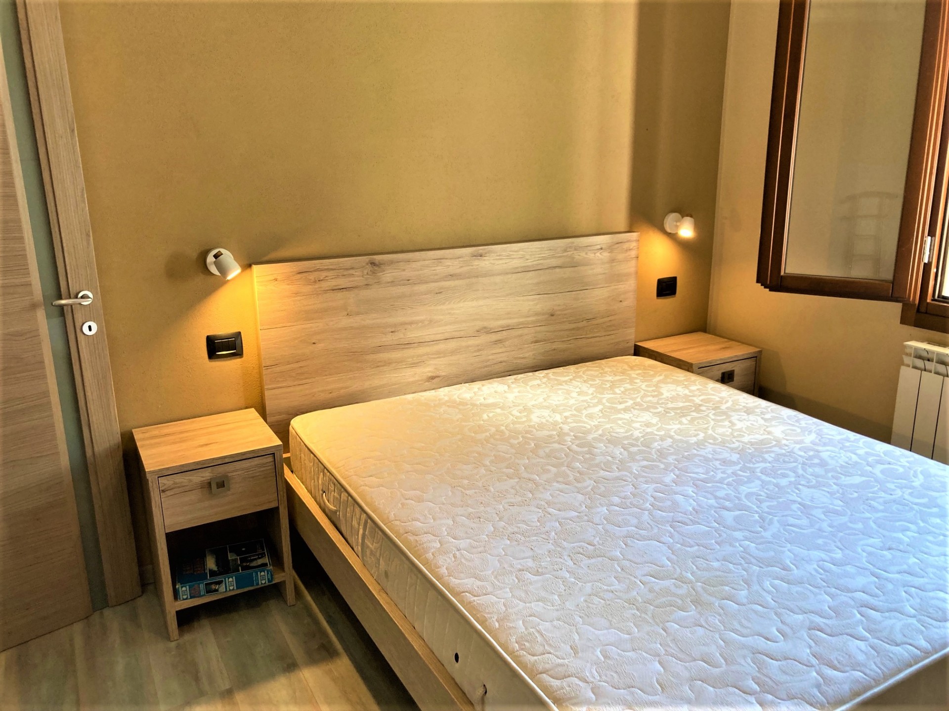 Letto costruito su misura in legno di abete anticato con como' e comodini laccati bianco antico.