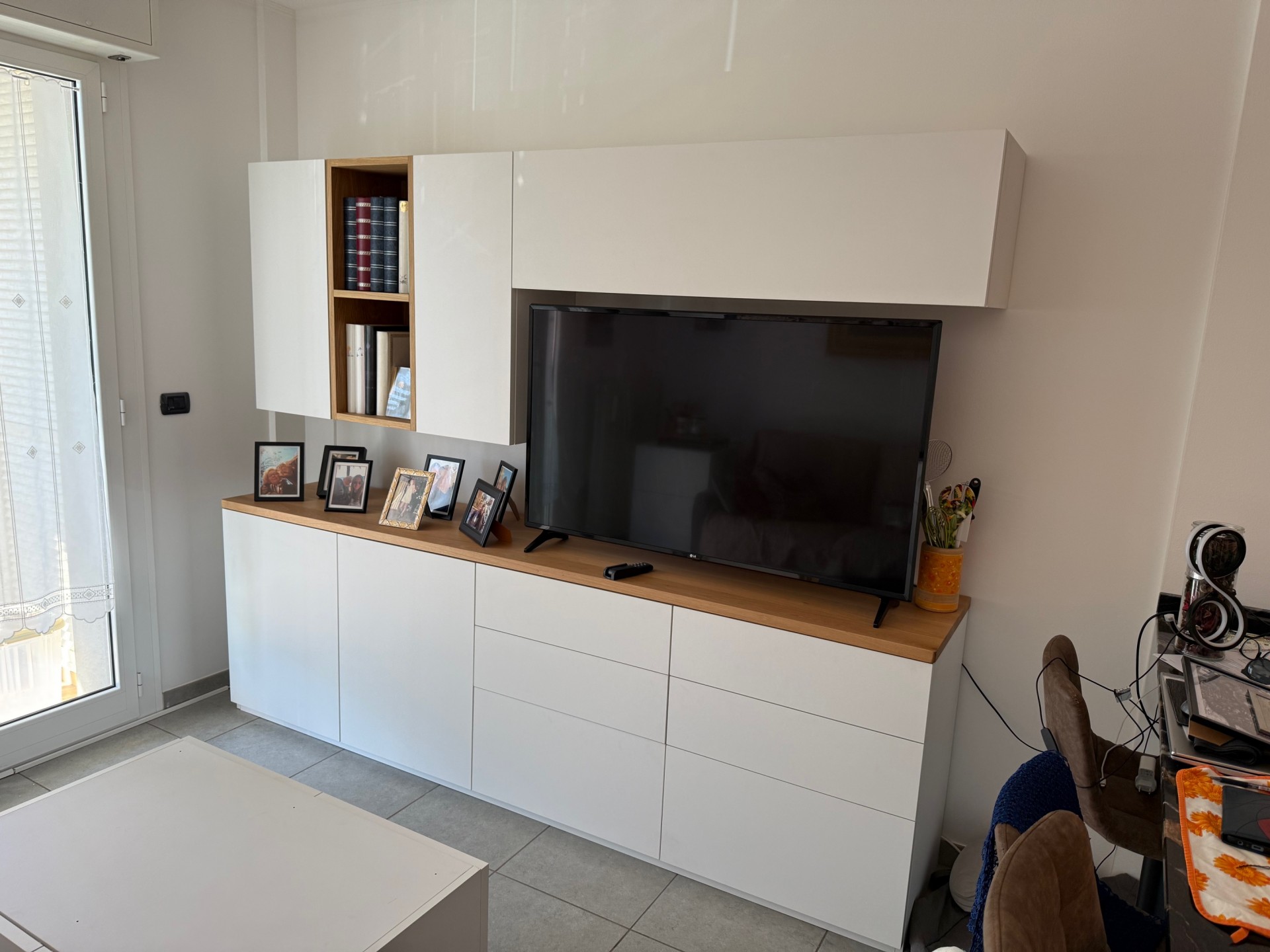 Mobile per tv costruito in legno su misura e laccato con 3 colorazioni a scelta. Abbinamento possibile con una libreria costruita su misura che richiama gli stessi colori.