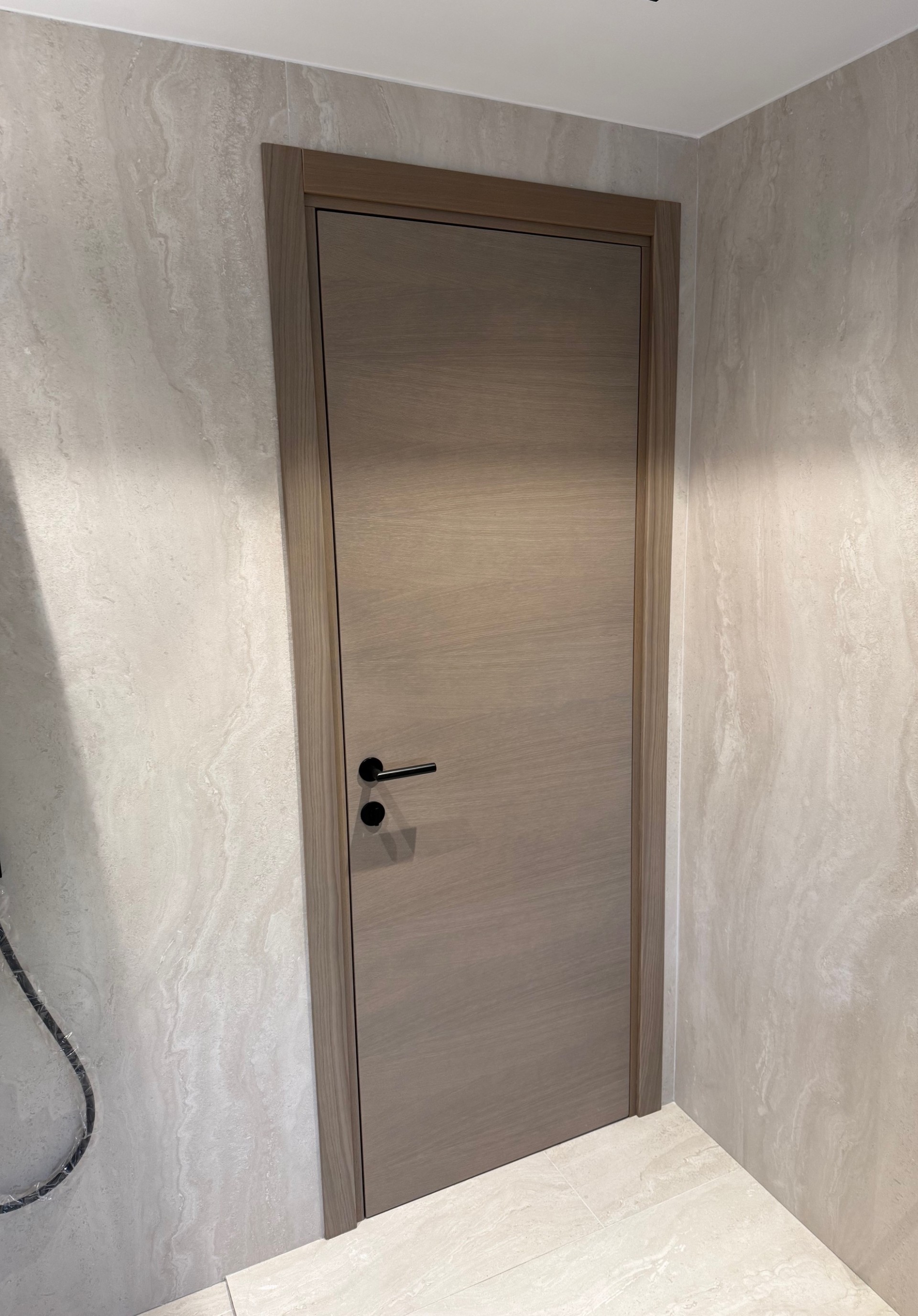 Porta in legno di rovere costruita su misura. La porta è costruita con un'anima in legno rivestita da ambo i lati da cartelle di rovere anticato assemblato con spessori diversi e giunture non parallele. L'effetto della venatura può essere verticale o orizzontale. E possibile avere questa porta anche per esterno nella versione doulbe face: