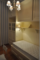 Cameretta per bimbo costruita su misura in legno laccato stile provenzale, sul lato sinistro armadio capiente con 2 cass ...