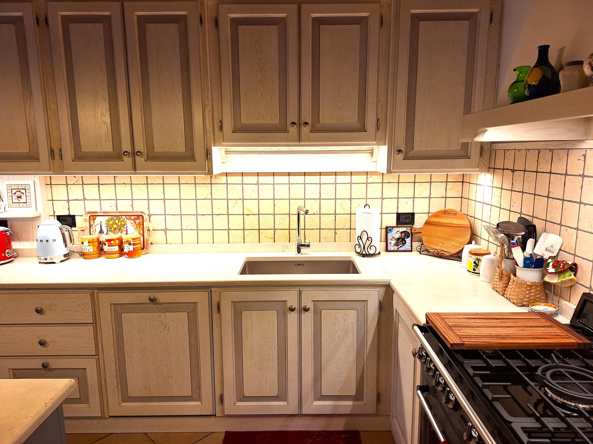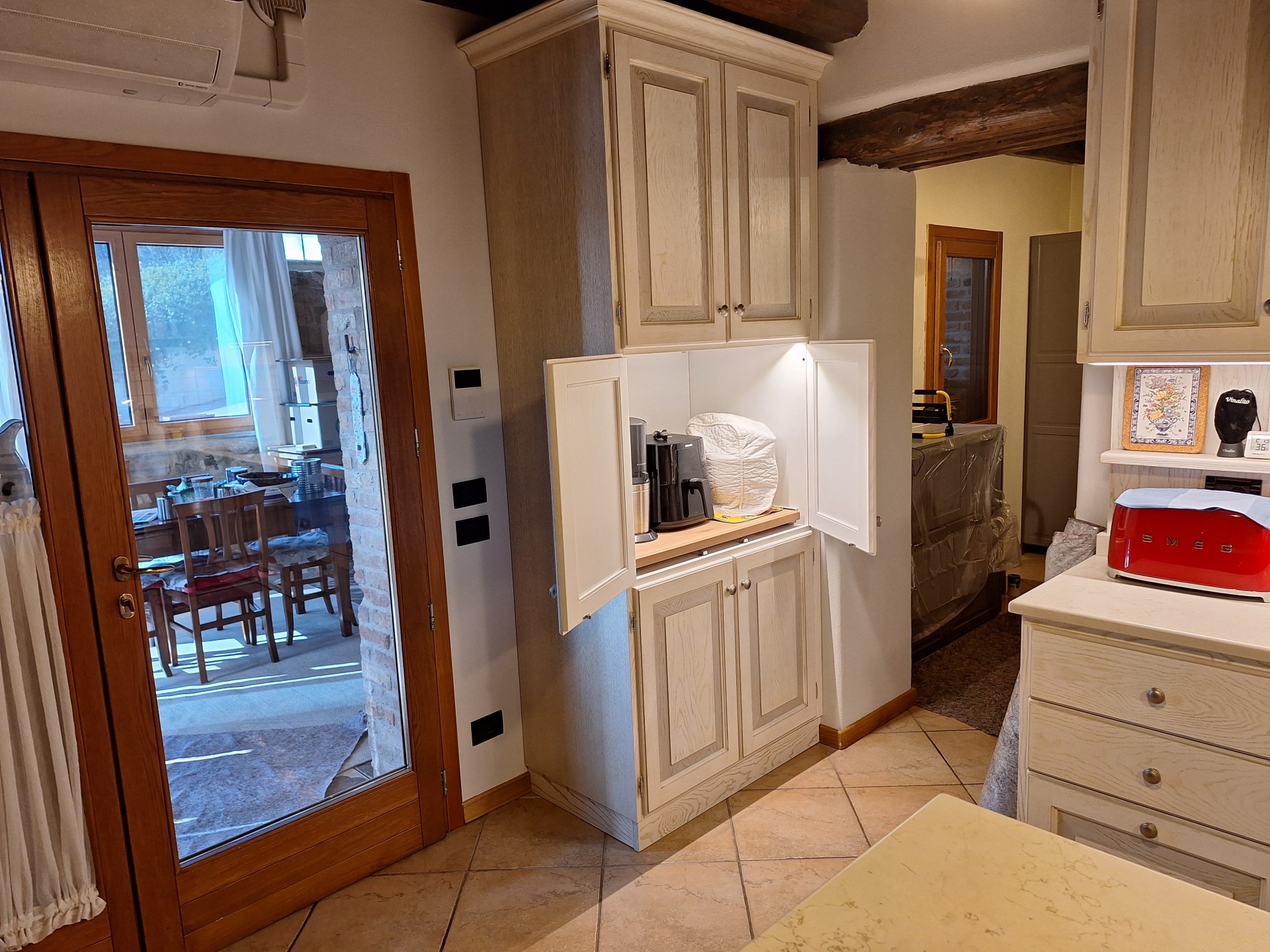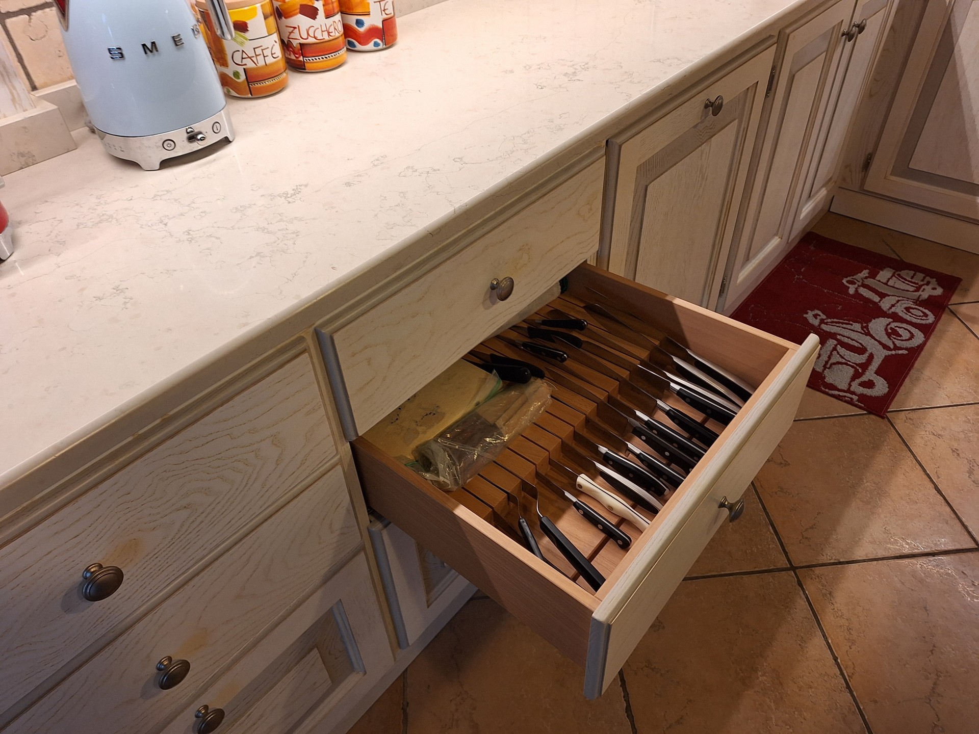 Cucina costruita artigianalmente su misura. Anche gli accessori della cucina sono stati realizzati su misura su richiesta del cliente.
