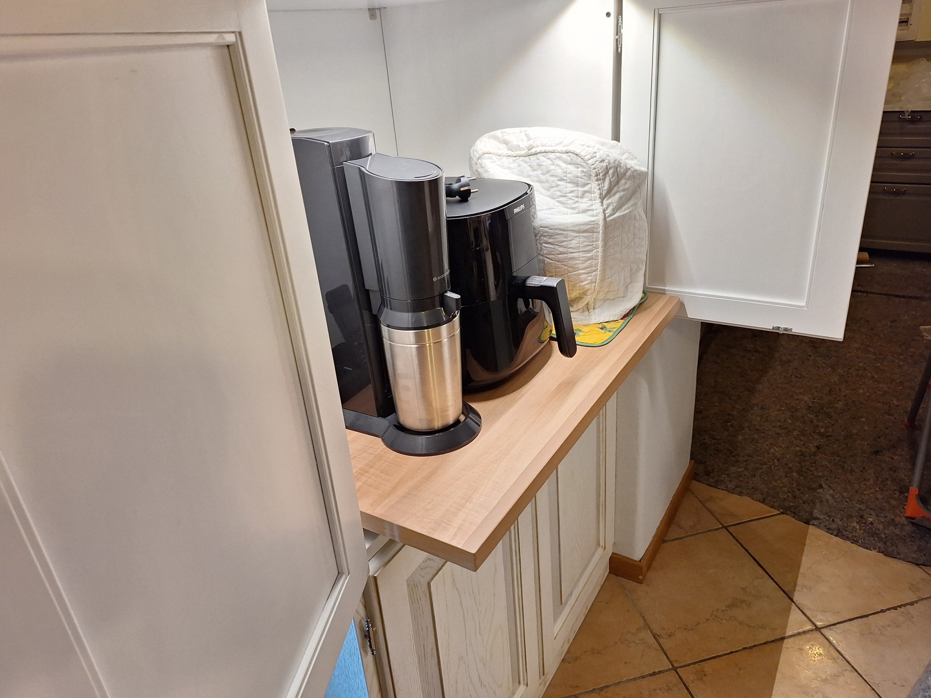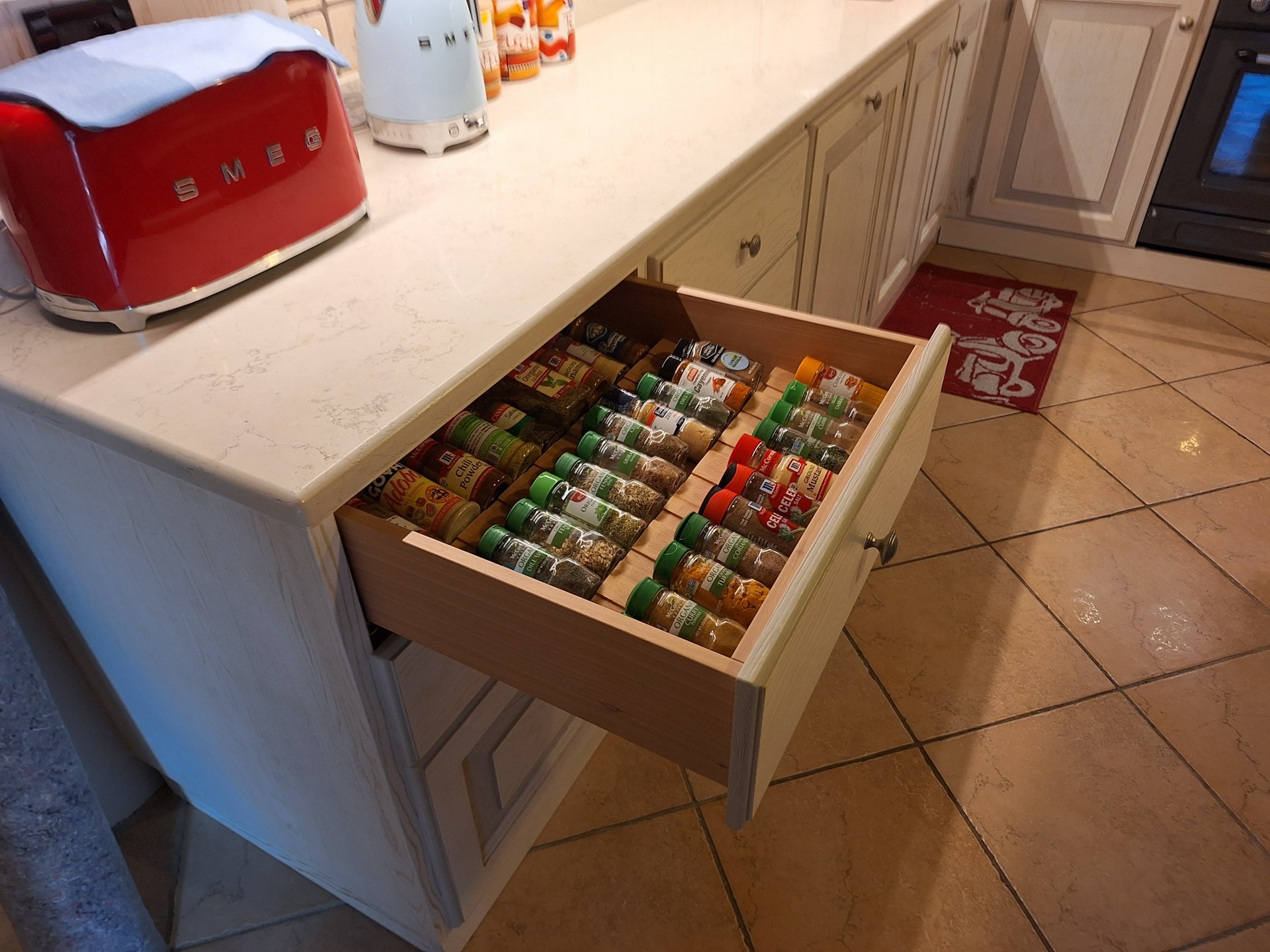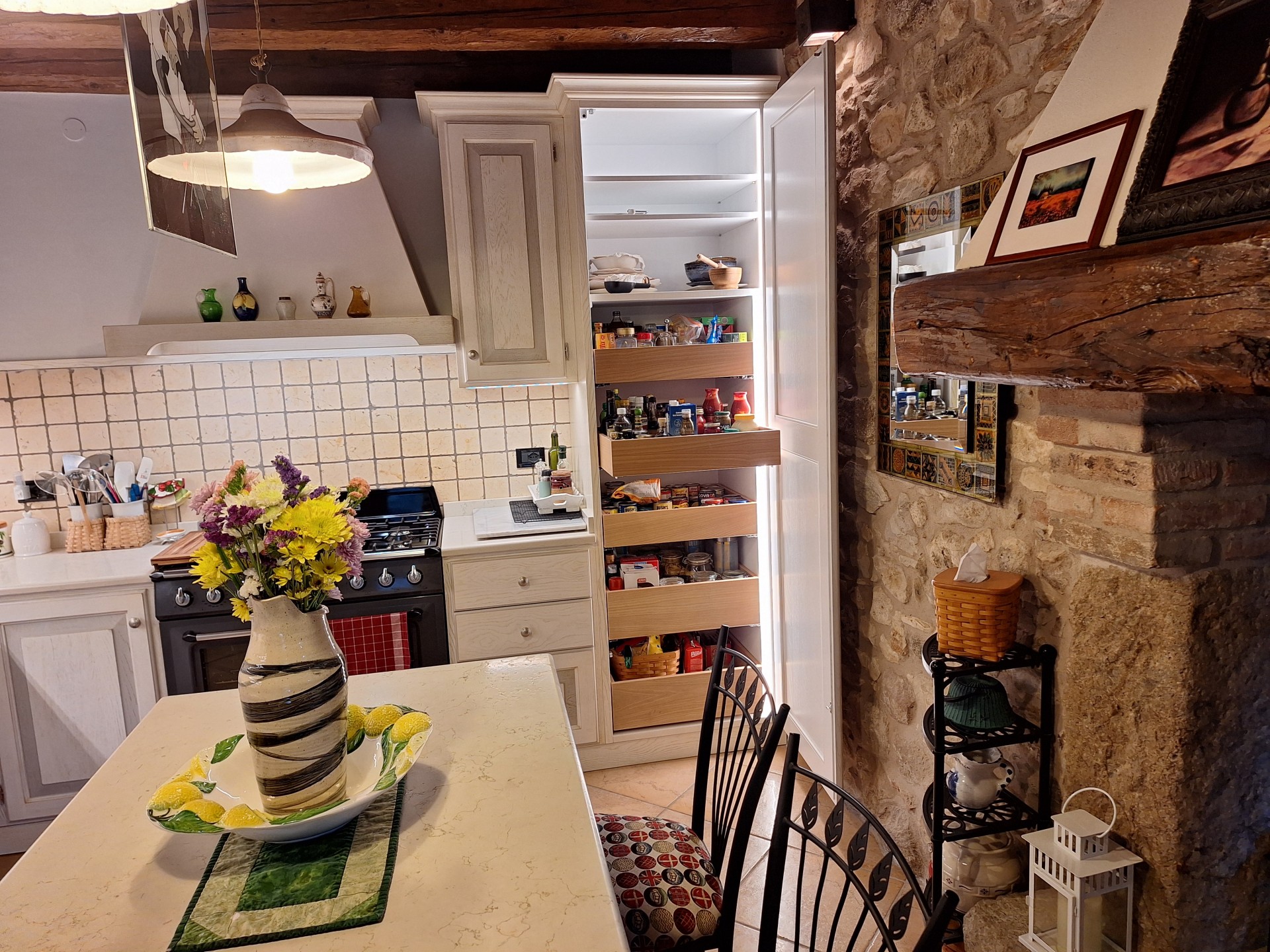 Cucina costruita artigianalmente su misura. Anche gli accessori della cucina sono stati realizzati su misura su richiesta del cliente.