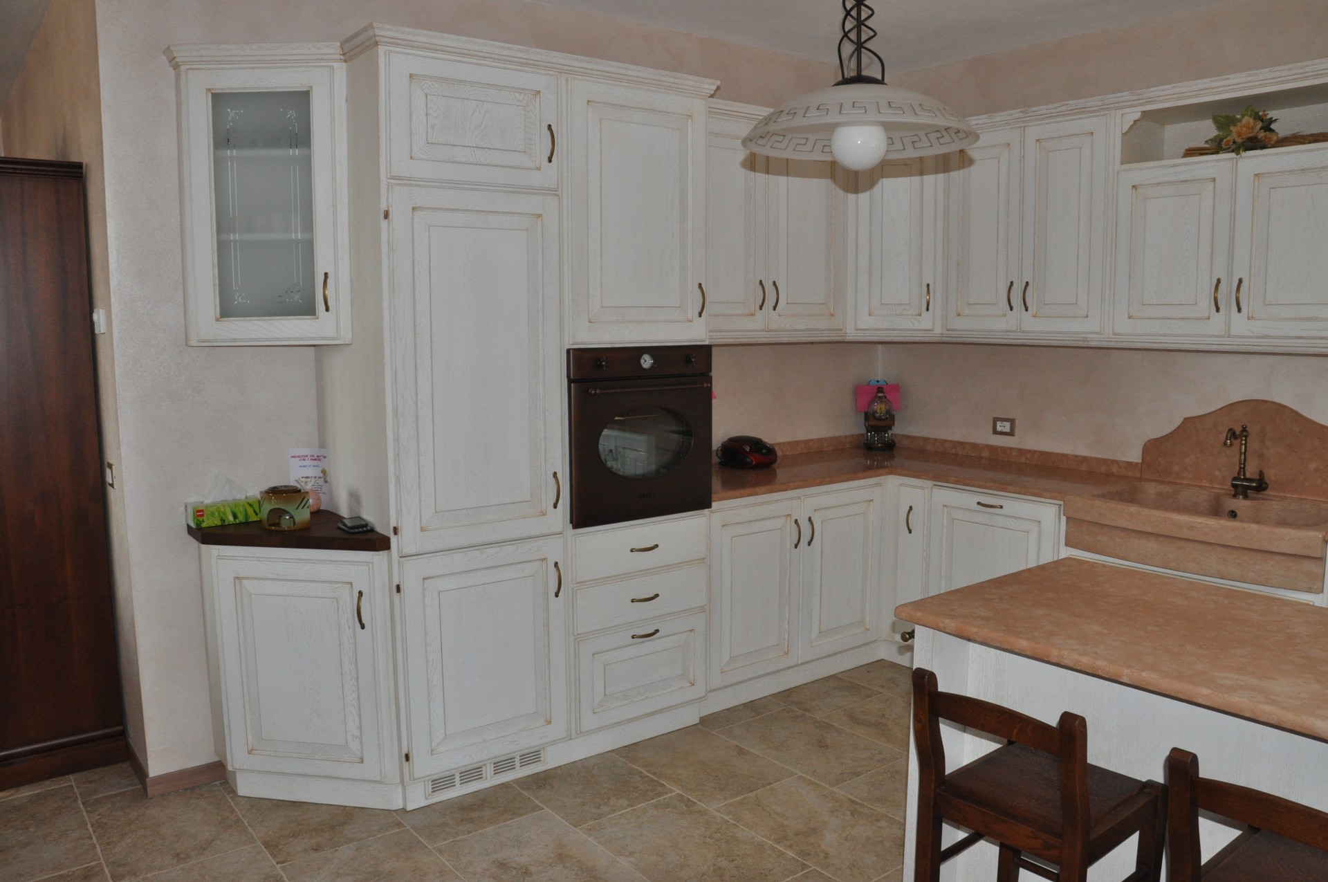 Cucina con penisola modello country, lavello in marmo scavato, costruita su misura in legno di rovere laccato.