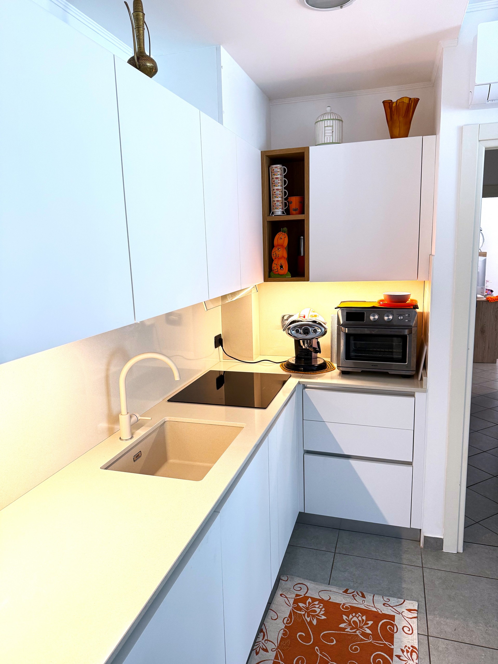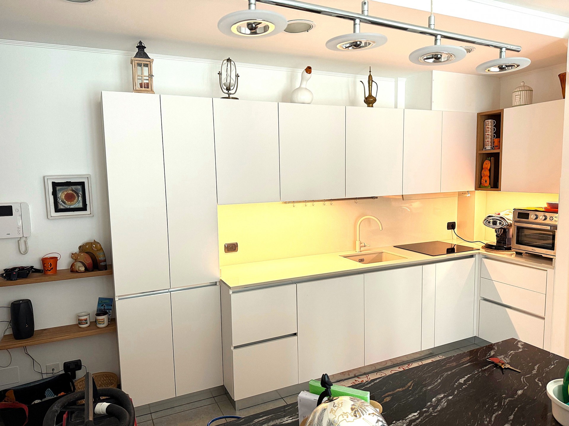Cucina artigianale in stile moderno progettata dall'arredatore Luca per ottimizzare gli spazi in un bilocale.