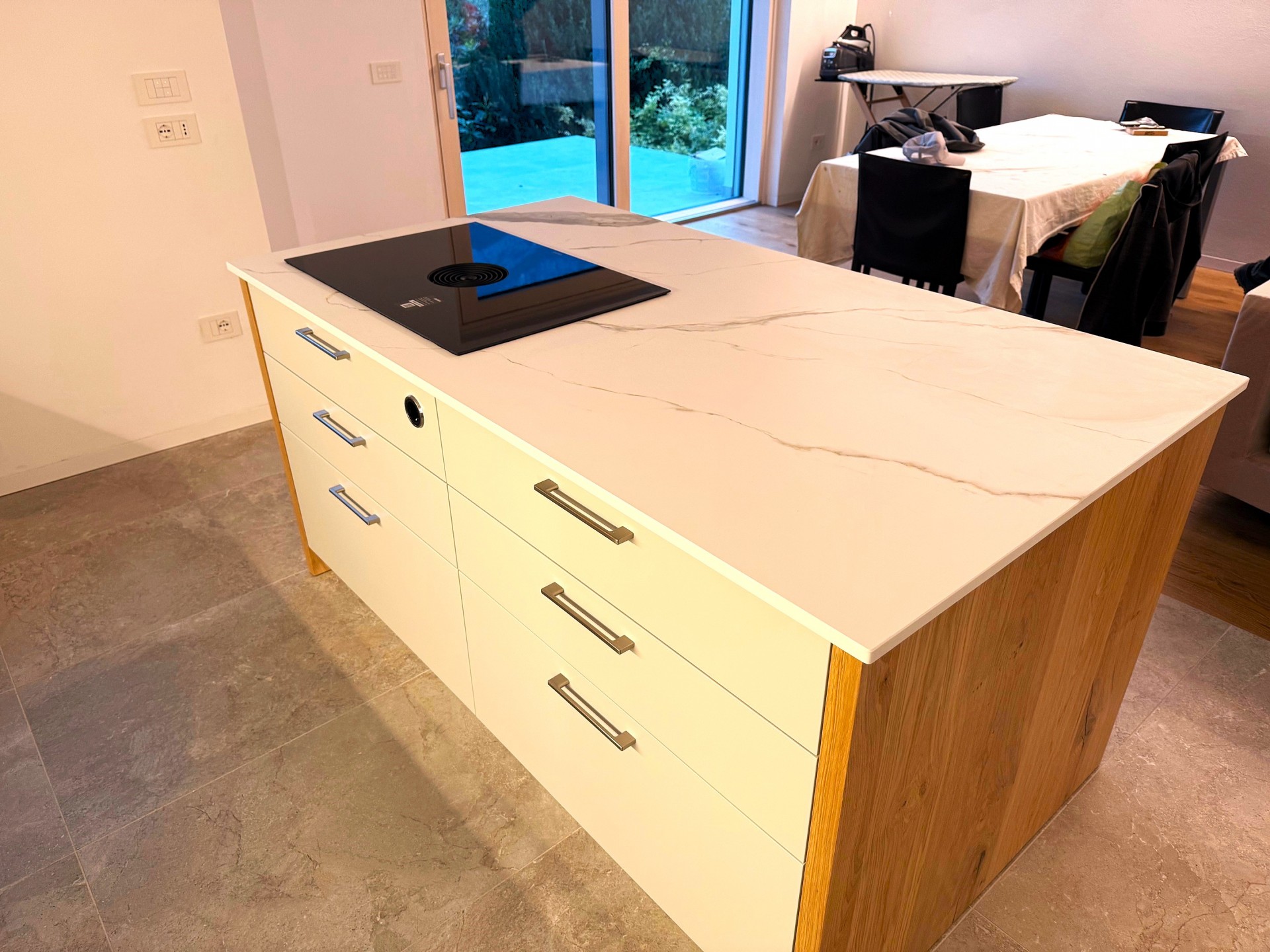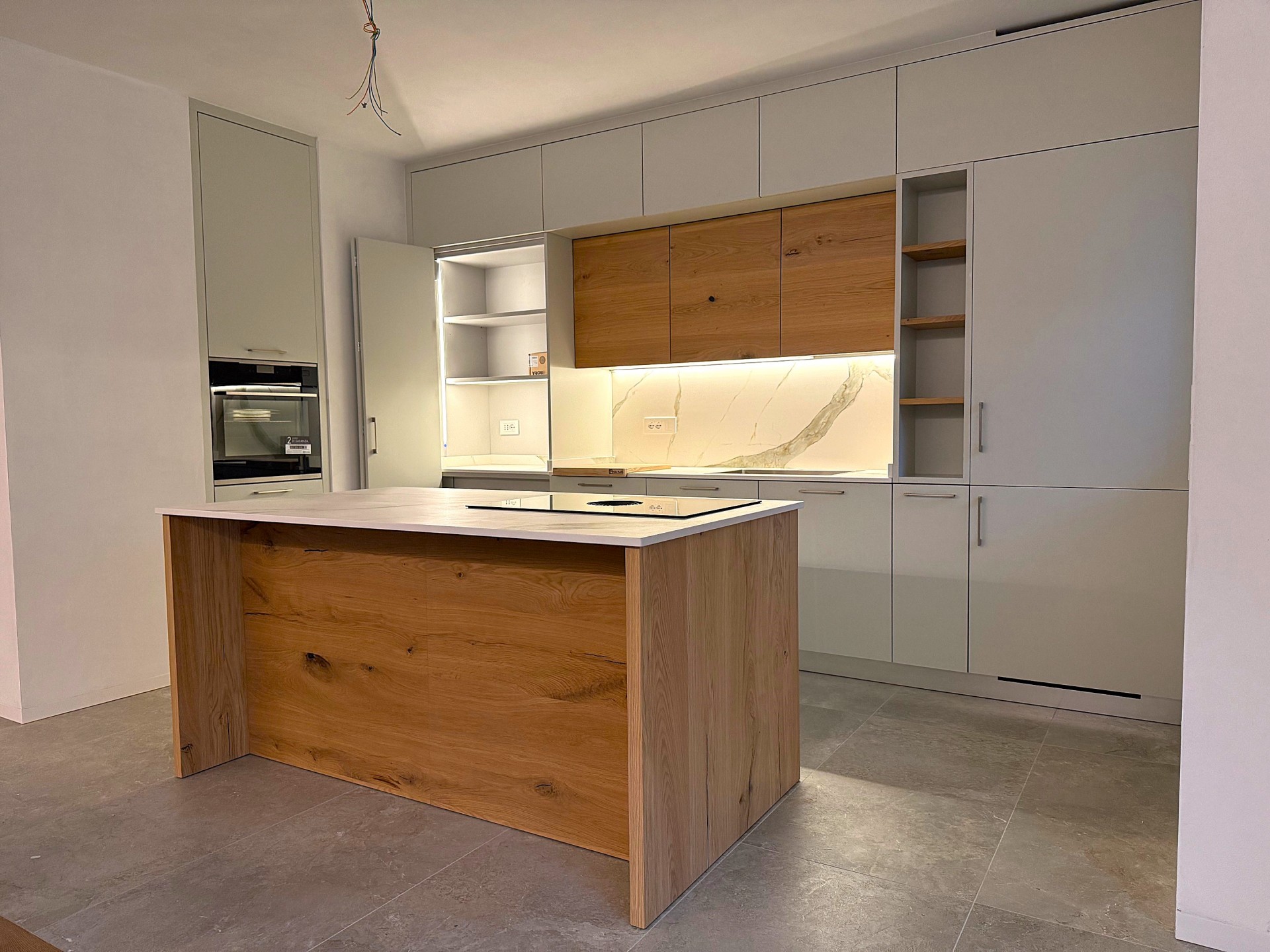 Cucina artigianale con dispensa ed isola costruita su misura.