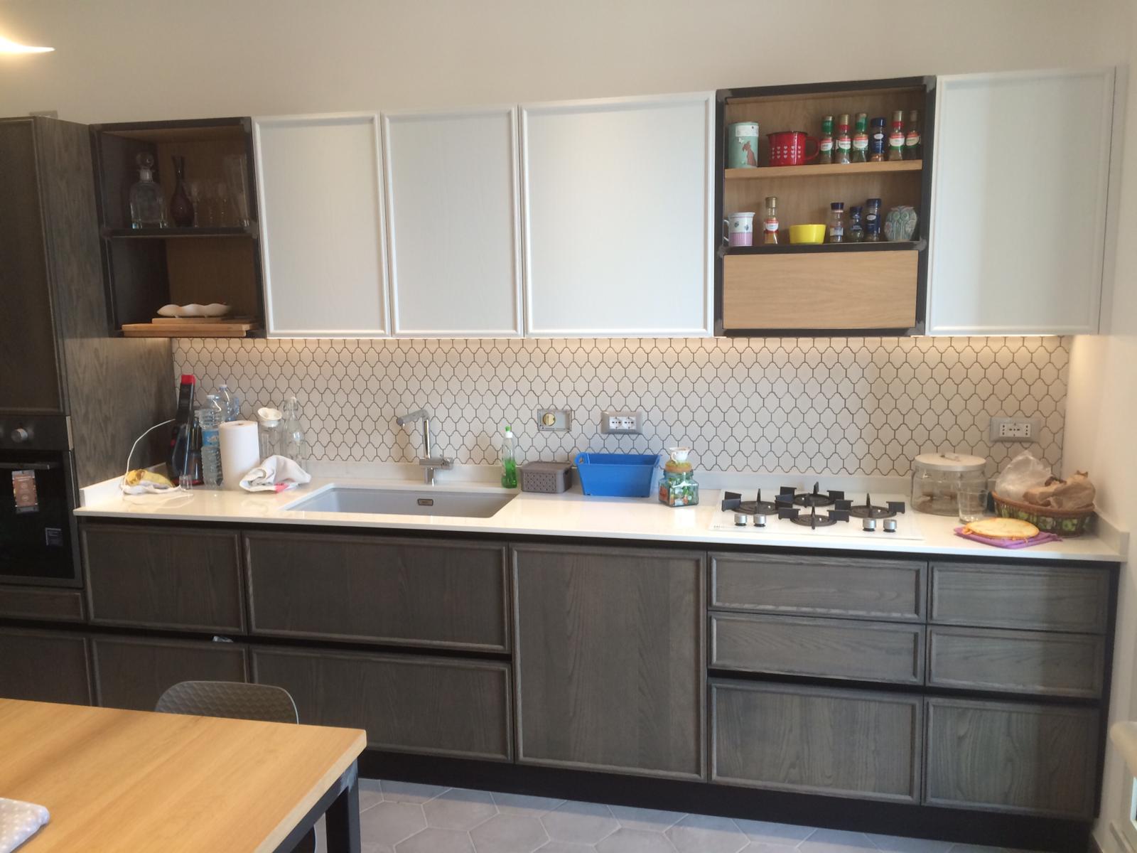 Cucina costruita su misura con anta in legno di frassino grigio. Questo modello è esposto nello showrrom di Cerea ed Albisola.