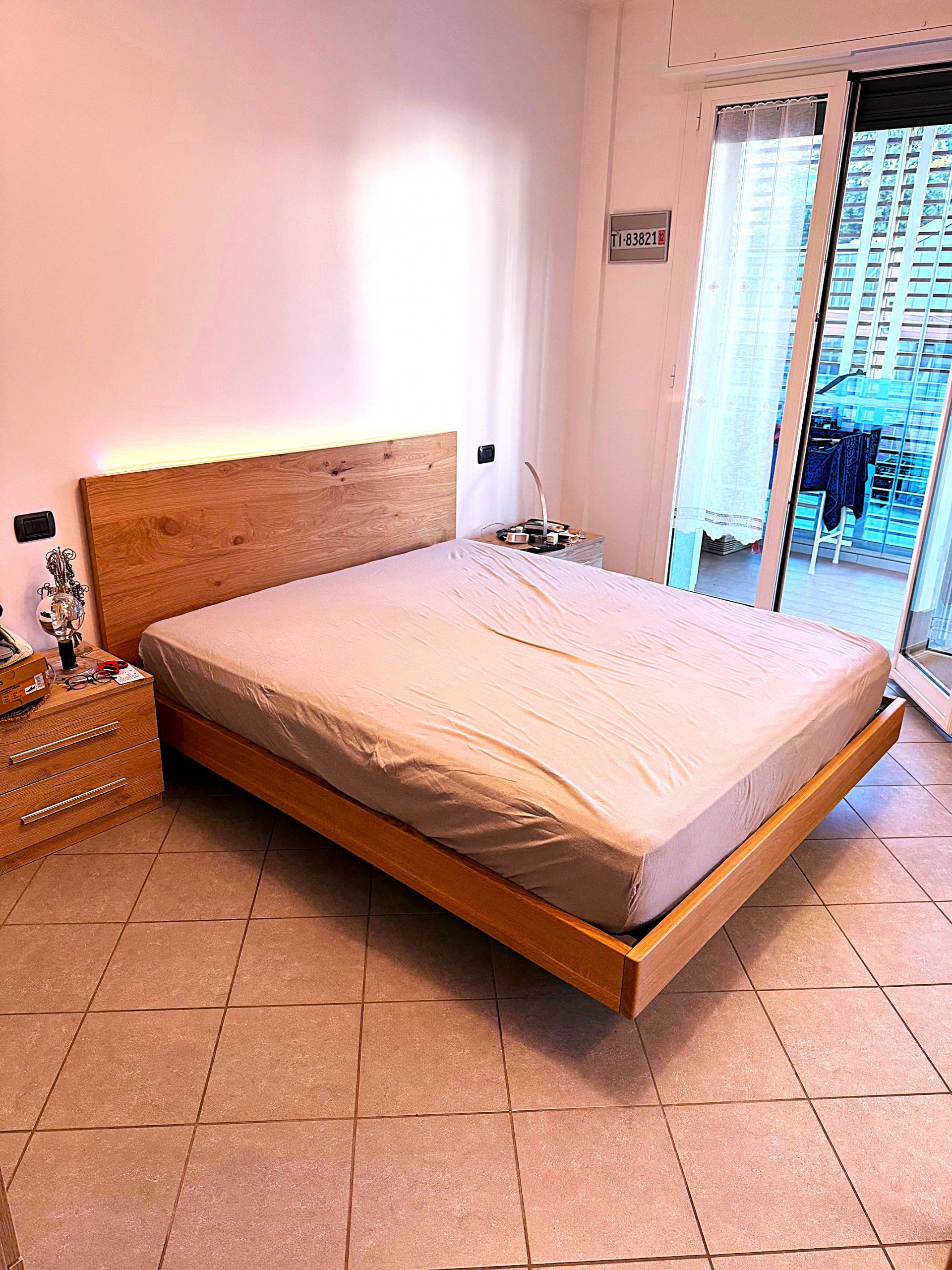 Letto artigianale costruito su misura in legno di rovere con effetto sospeso. La struttura artiganale lo rende robusto e confortevole mentre il led inserito sopra alla testata gli da il tocco di modernità.