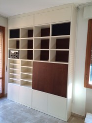 Libreria costruita su misura in legno laccato a Modena con inserimento della zona tv.