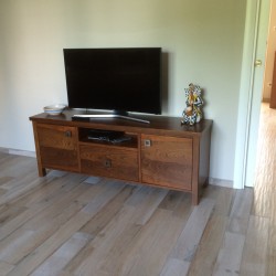 Mobile tv costruito su misura in legno di rovere laccato a poro aperto.